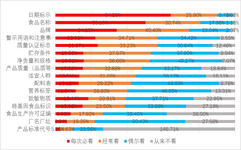 近七成消費(fèi)者在購買食品時(shí)有查看食品標(biāo)簽 標(biāo)識(shí)的習(xí)慣,九成消費(fèi)者關(guān)注食品生產(chǎn)日期和保質(zhì) 期,多數(shù)人希望保質(zhì)期以日期形式標(biāo)注。此外食品 名稱和品牌的關(guān)注度也非常高,而產(chǎn)品標(biāo)準(zhǔn)代號(hào)、 廠名廠址和生產(chǎn)許可證編號(hào)等信息關(guān)注者較少。