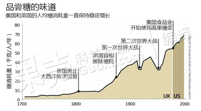 從那以后,糖類消費的上升趨勢幾乎就從未中斷。從20世紀70年代初到21世紀最初的幾年,美國成年人平均每天攝入的卡路里增長了13%,主要是因為食用了更多的碳水化合物,其中就包括糖。相比1977年,1996年美國成年人平均每天要從食品中人工添加的糖里多攝入83卡路里的熱量。今天,美國每人每年的平均糖消耗量已經接近40千克,比每天20茶匙還要多。