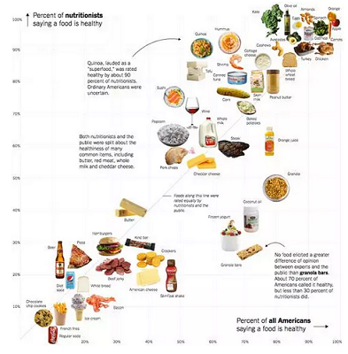 我們針對美國人和一組營養專家進行問卷調查,詢問他們覺得哪些食物對身體好,哪些不好。