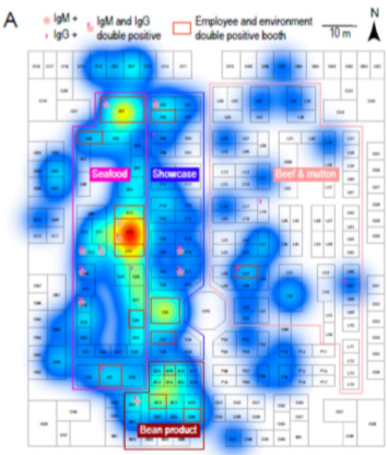 從感染的顧客中篩查到 5 個人,IgG 和 IgM 均呈陽性,他們在新發地的交集是 S14 攤位。(IgM 表示感染時間比較早)