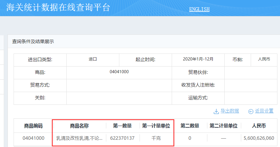 健康時報記者在中國海關官網查詢發現,2020年1月~2020年12月,我國共進口乳清粉62萬噸(622370137千克)。