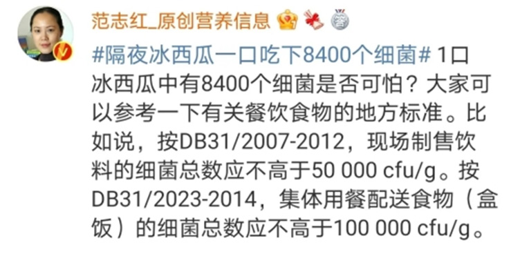 看到這幾個(gè)食物的微生物安全標(biāo)準(zhǔn),你還對(duì)“隔夜西瓜”那個(gè) 336 個(gè) / 克的細(xì)菌數(shù)大驚失色嗎?而且,節(jié)目中其他稍微注意了切西瓜的刀板清潔的,隔夜后的細(xì)菌數(shù)更低。