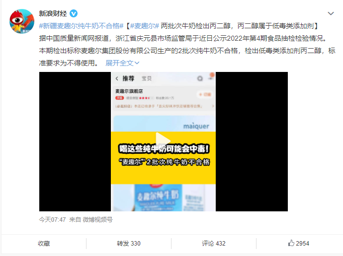 6 月 30 日,“新疆麥趣爾純牛奶不合格”的詞條一度沖上微博熱搜第一。據中國質量新聞網報道,近日,浙江省慶元縣市場監管局公示的 2022 年第 4 期食品抽檢檢驗情況中稱,麥趣爾集團股份有限公司(下稱“麥趣爾”)生產的 2批次純牛奶不合格,不合格項目為丙二醇。