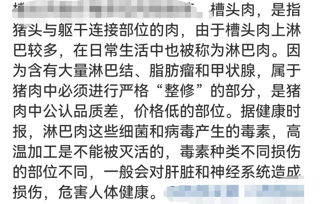 所謂“槽頭肉日常生活中被稱為淋巴肉”,不清楚這個說法是否普遍,但是“槽頭肉”并不等于“淋巴結(jié)”。豬的身上有幾百個淋巴結(jié),遍布全身,槽頭這個部位只是相對比較集中而已。