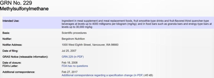 MSM 并不是新東西,它天然存在于人體以及動物體內,包括果蔬在內的植物中也廣泛存在,甚至 在海洋空氣中都能檢測到。美國 FDA 曾于 2007 年對 MSM 的食用安全性進行評估并將它列為 GRAS 物質, 即“通常認為是安全的”,有點類似于中國的新食品原料。