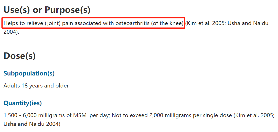比如韓國規定使用 MSM 的產品可以標注“可能有助于關節和軟骨健康”。在加拿大,MSM 可以用于“緩 解骨松帶來的膝蓋疼痛”。或許這也是網傳“MSM 是止痛藥”的源頭,但實際上它的緩解疼痛作用和止