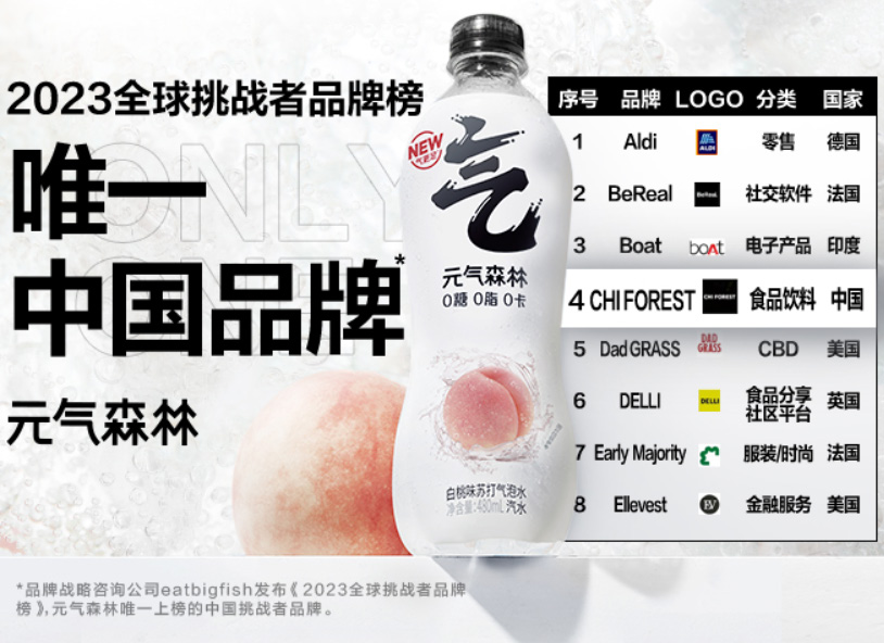 近日,品牌戰(zhàn)略咨詢公司 eatbigfish 發(fā)布《2023全球挑戰(zhàn)者品牌榜》,中國(guó)食品飲料企業(yè)——元?dú)馍殖蔀?2023 年唯一上榜...