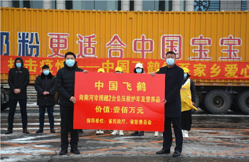 11 月 6 日,中國飛鶴根據抗疫實際需求,向黑河市捐贈價值 100 萬元的 2 臺負壓救護車及營養品,以實際行動助力黑河戰勝疫情。