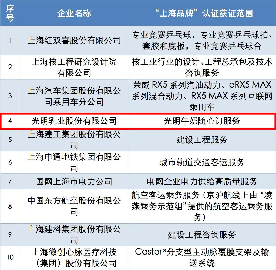 2022 年“上海品牌”認證制度五周年之際,“上品”卓越貢獻品牌評選活動又評選出了 10 個優秀代表,其中光明隨心訂名列在位。這充分體現了一直以來光明乳業嚴格實施“以質量為核心,以創新為動力,以品質促品牌”的質量戰略,再次用自身的品質與服務,為品牌代言。2018 年光明乳業首次通過認證,成為首家以食品通過認證的企業,2022 年光明隨心訂再創佳績,榮耀繼續。