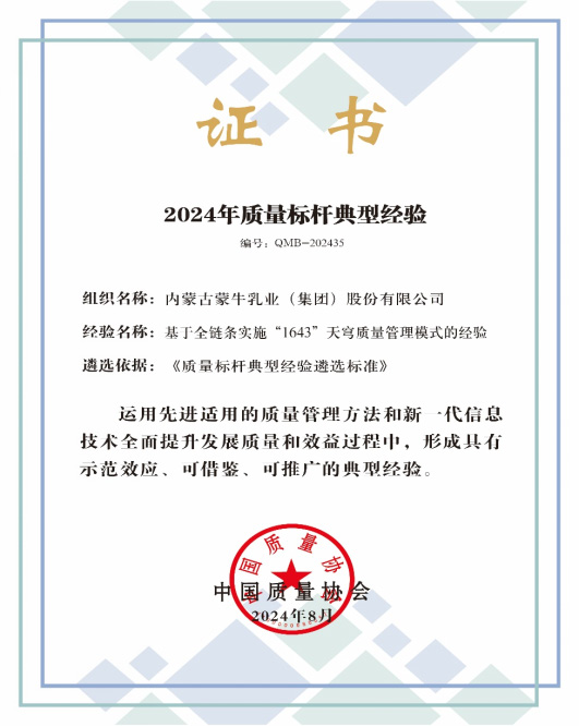 8月15日,中國質量協會正式發布“2024 年質量標桿典型經驗”,蒙牛集團提報的“基于全鏈條實施‘1643’天穹質量管理模式的經...