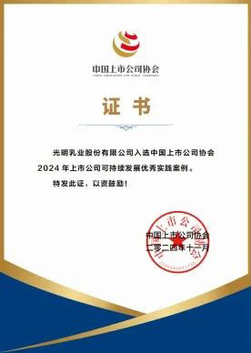 近日,光明乳業憑借在 ESG 方面的優秀表現,從中脫穎而出,榮獲 2024 中國企業ESG“金責獎”公司治理責任優秀企業榮譽。