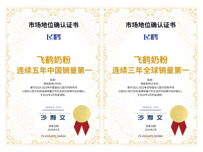 近日,國際權威調研機構弗若斯特沙利文,向飛鶴頒發多項“第一”認證證書。認證信息顯示,2019 年 -2023年度,飛鶴奶粉在中...